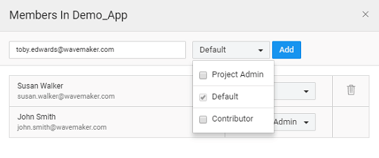 • Enter the email id of the Member you want to add as Project Admin or Contributor in the appropriate text box and click the Add button. This feature is available only to the Project Admins.