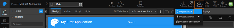 • Export Project allows you to create a ZIP or a WAR file including the project along with the resources used. The projects are Maven compliant.