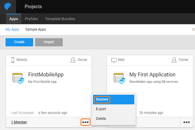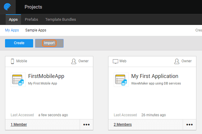 You can import a project or a prefab in the ZIP format using the Import from the Project Dashboard. Choose the file from the import dialog and click on Import. These are the files that were created from the Export option of WaveMaker Studio as discussed above.