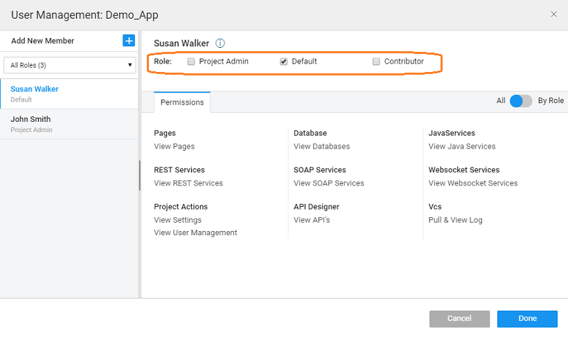 • Default: This is the default role when a user is assigned to a Project. This includes only view privileges.