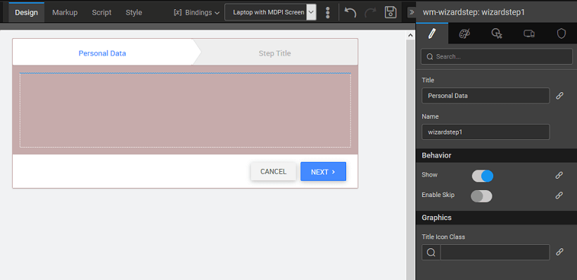 1. Content: The content can only be an inline content which means that you have to design each step of the wizard like you design every page in WaveMaker. You cannot use partial content in any step of the wizard.
