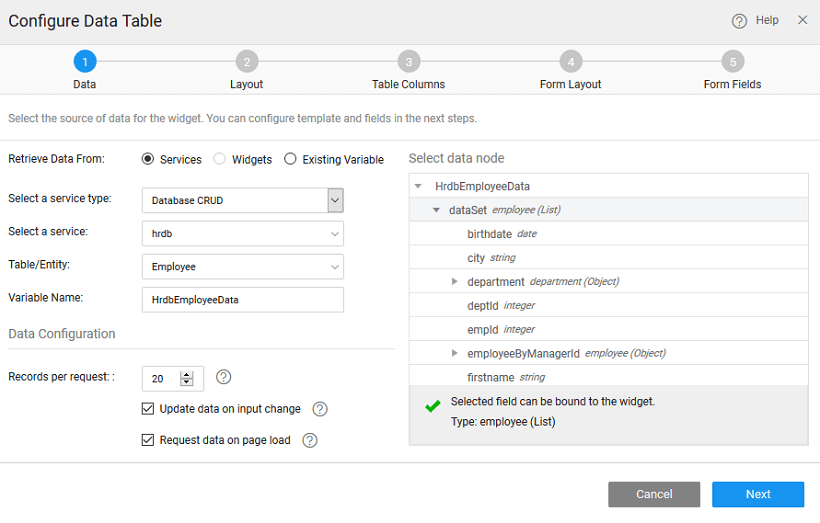 There can be different scenarios to deal with when configuring your Data Table Widget with a data source. The data source can be in the form of a service like Database or web or Jave service or from an another widget on the page.