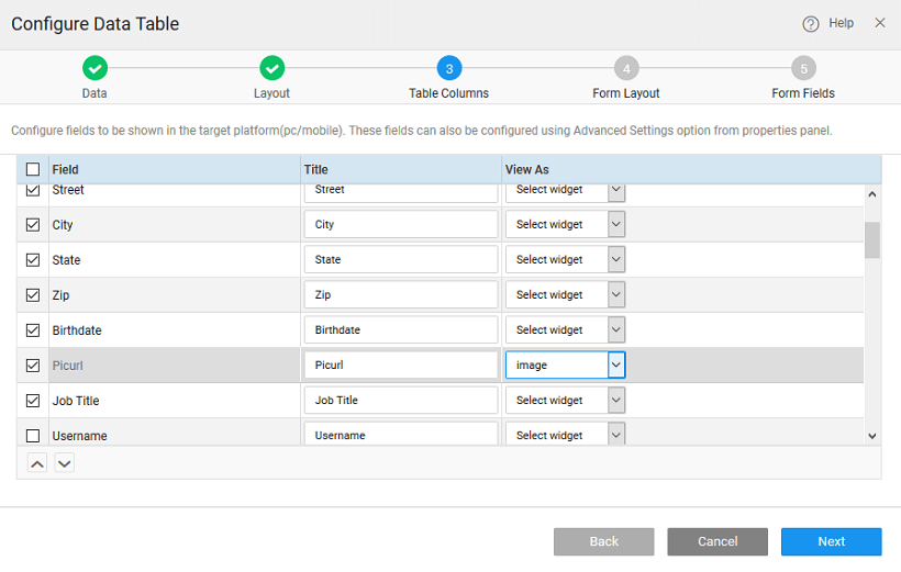This step will allow us to select the fields to be shown in Data Table and once done