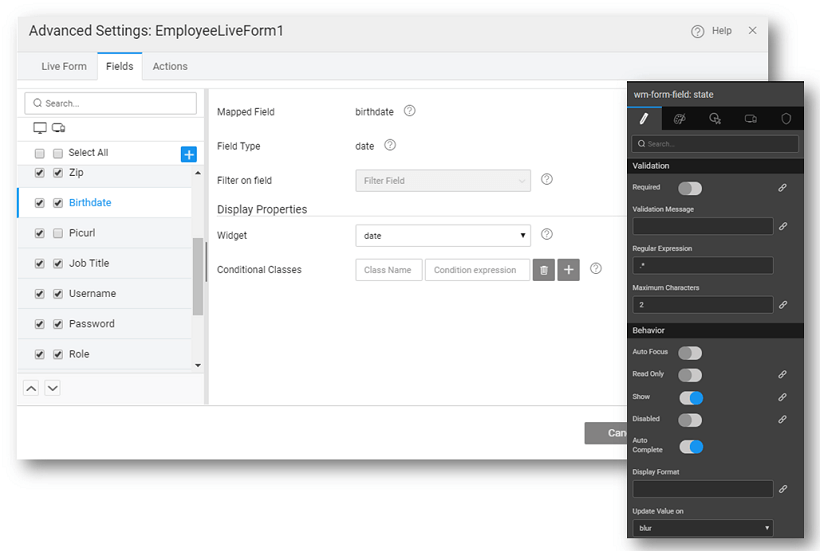 4. modify the behavior of individual fields, from the canvas, by selecting any field on the form and setting the properties: