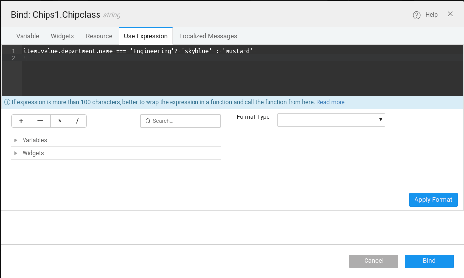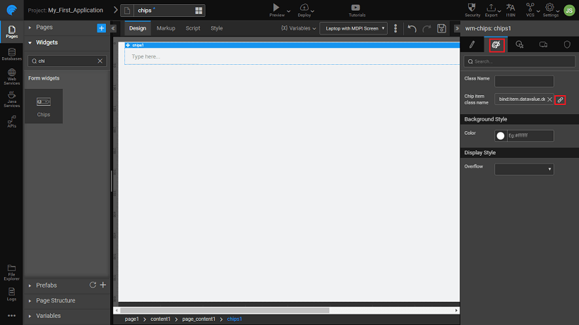 - From the Data tab, bind the values to those returned by the Chips widget.