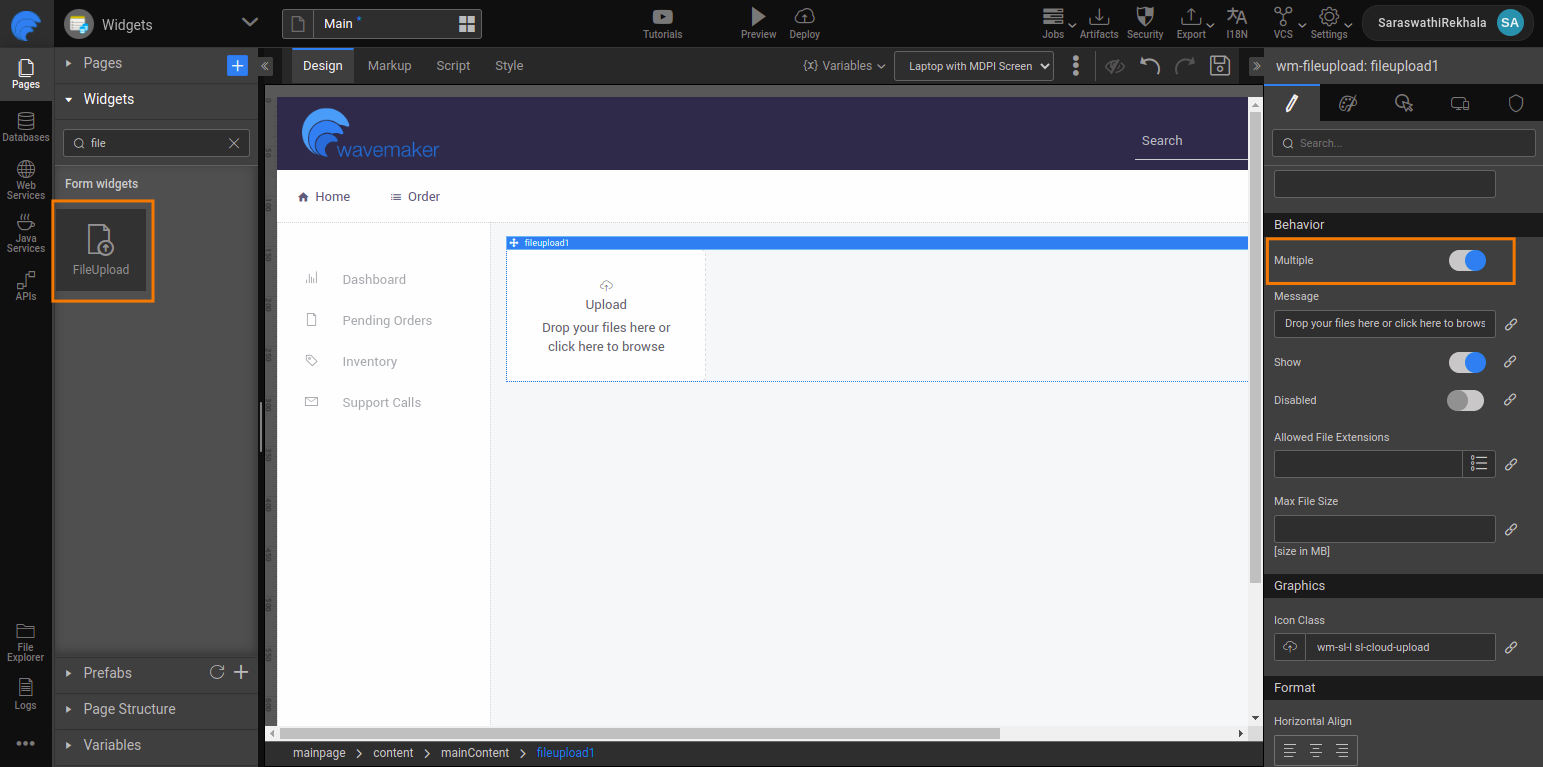 - From the Properties panel, set the Multiple property to true, this will enable us to upload multiple files, else you can upload a single file at a time.