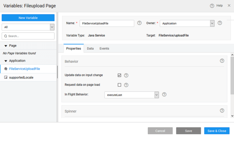 - You will be prompted to create a FileServiceUploadFile Variable. For this demo purpose, retain the default selections of Update data on input change. NOTE: You can create and use any service, but keep in mind that the operation selected should be able to accept file data. The default file service uploadFile operation fulfills this requirement.