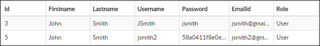• Two column layout with first name, last name and email id in the first column; username, password, and role in the second column.