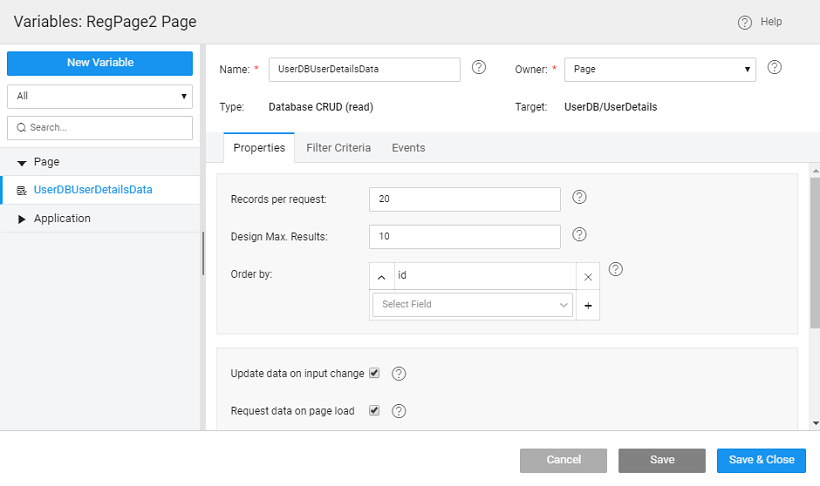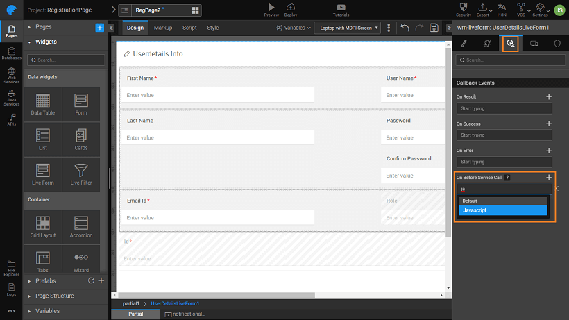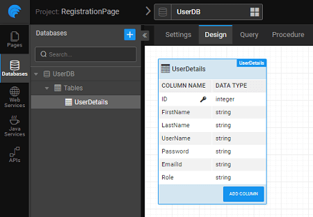 Drag and drop a Live Form widget, use the Database CRUD from the UserDB service and the UserDetails table and set the properties, as per your app requirements. We have used the following settings: