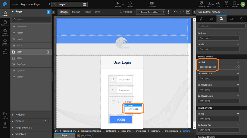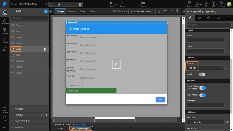 • Add a pagedialog widget, with content as the registration partial page.
