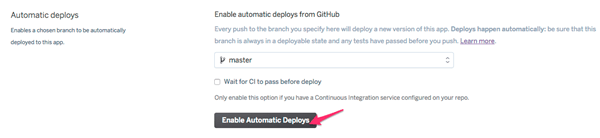 4. Finally, enable auto deployment. Any push to GitHub repository will automatically deploy your application now. heroku_deploy3
