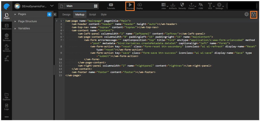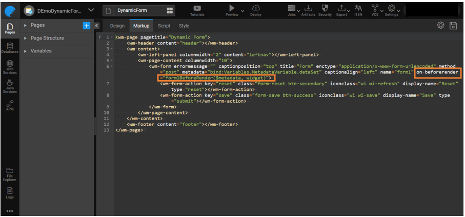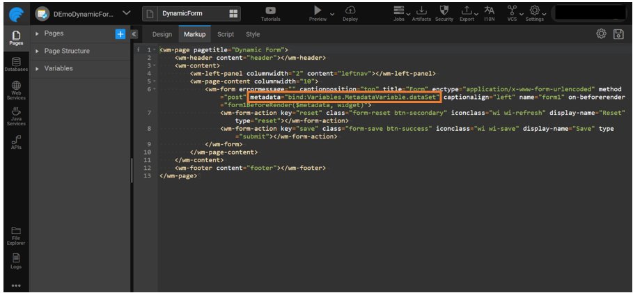 The created variable will be used in the Markup tab to bind the metadata with the Form.
