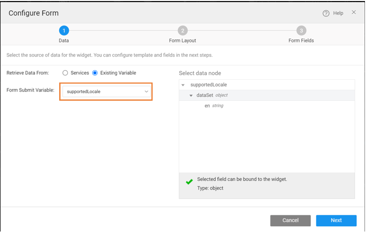 1. Drag and drop the Form widget with an existing variable as "supportedLocale" and uncheck the Fields as you are creating a Dynamic Form.