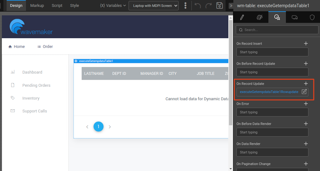 1. Ensure to click the Data Table and navigate to the Events tab from the Properties panel. Go to the On Record Update event, and select Javascript from the dropdown.