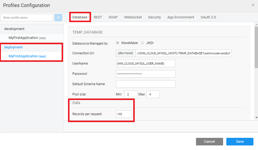 Please find the approach below: The "records per request" property on the variable will fetch a maximum of 100 records since there is a upper limit of 100 records set in the development profile(development.properties file).