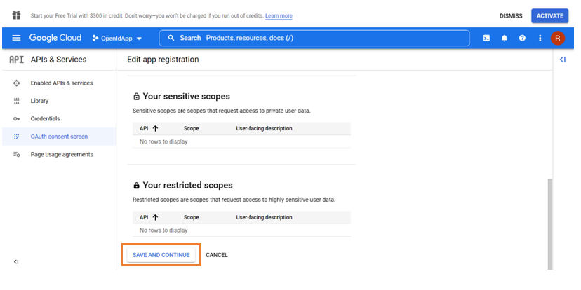 6. Click Save and Continue to save the provided scope information.