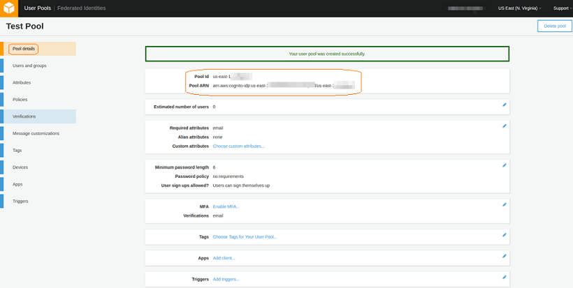 1. After creating the account, Login page shows up. Verification of the user should be done by going to to the Amazon Cognito Create User Pool page and click on Users and Groups in the Left Navigation Pane. This will show you the all the Users added to the user pool.