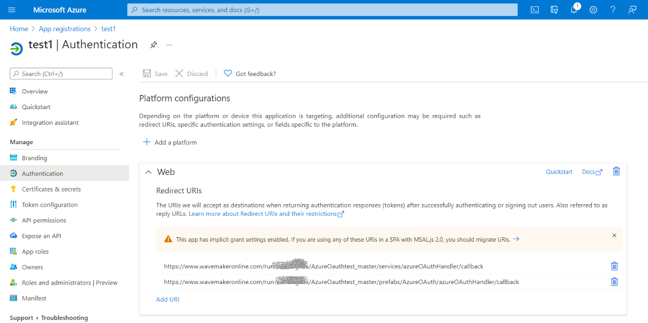 In the left panel under App Registration click Authentication and add redirect URIs as below.