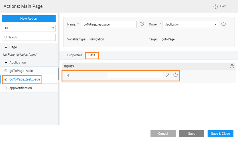 - The Application-scoped Navigation Action generated by default by WaveMaker for test_page can be used to bind a value for the id field from the Main Page. The param will be available in the data tab of the Actions (goToPage_test_page). You can also create another Navigation Action and use it in a different navigation flow.