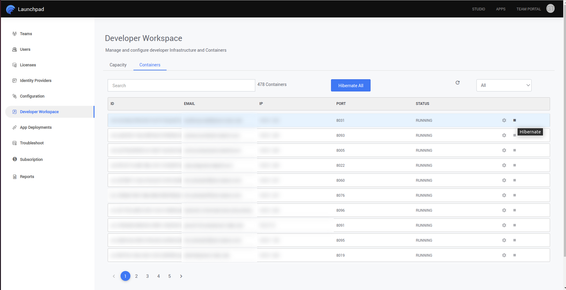 After this is done in all StudioWorkspace instances cross-check the running containers in the containers tab, all the containers should be in the passivated state