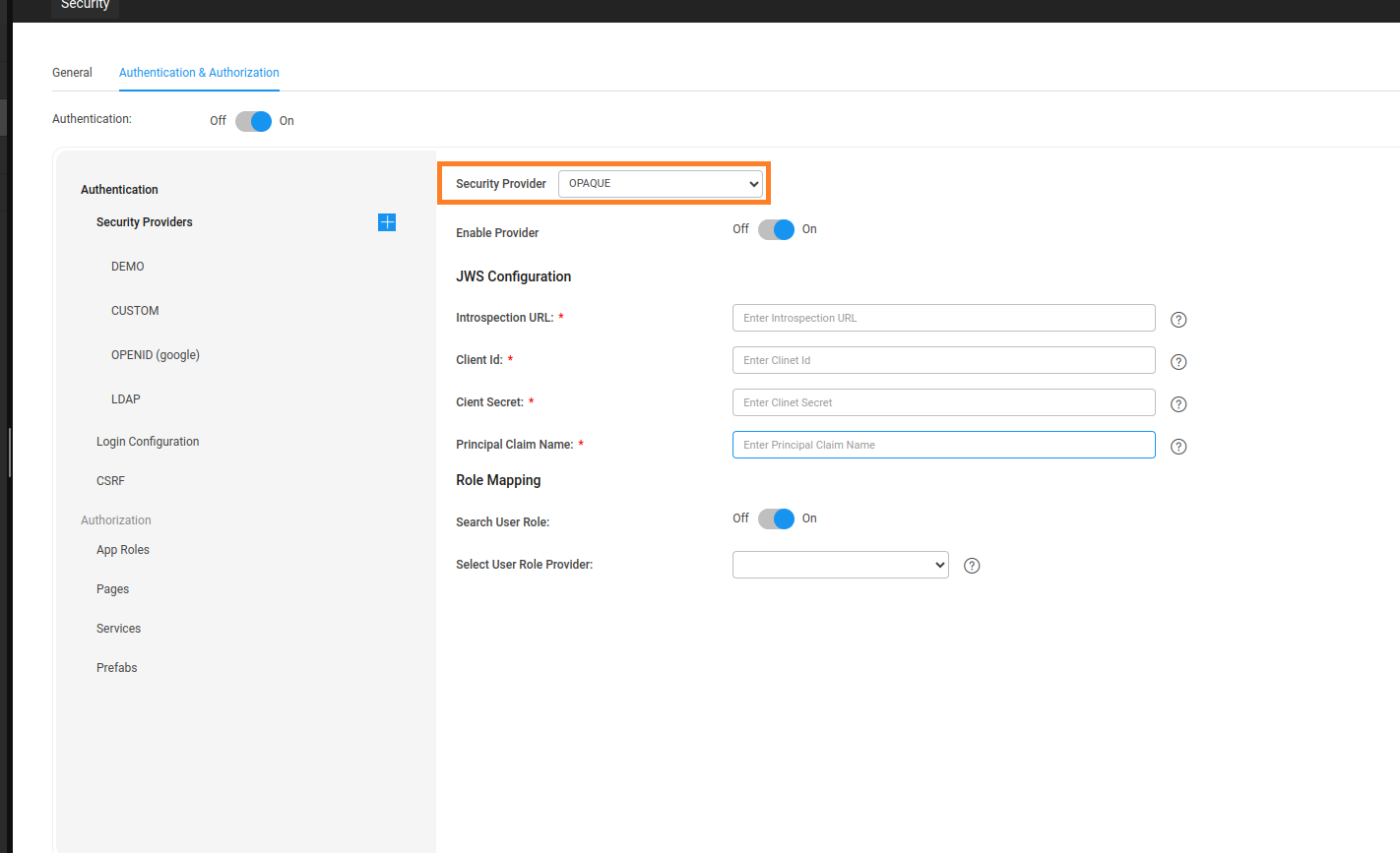 To apply JWS and Opaque security providers, users need to select the options from the Security Provider drop down available in Security under Settings.